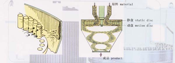 在機器內(nèi)部,物料受到離心力的作用,在動針和靜針之間猛烈撞擊,被反復打擊而粉碎。
